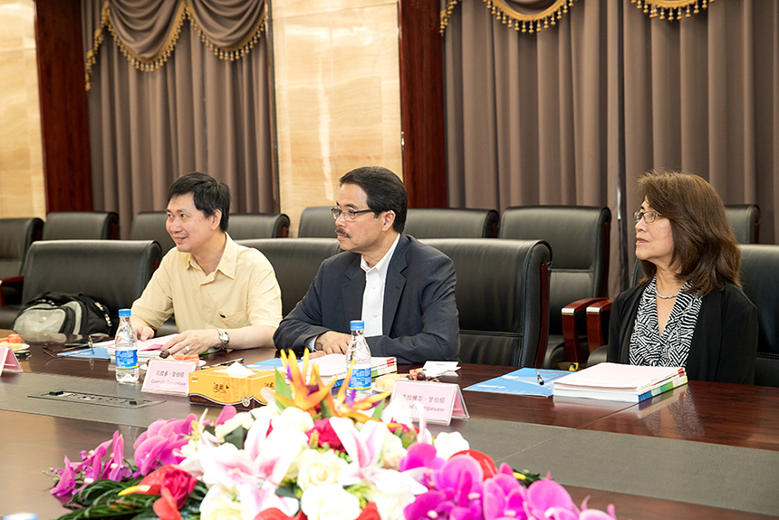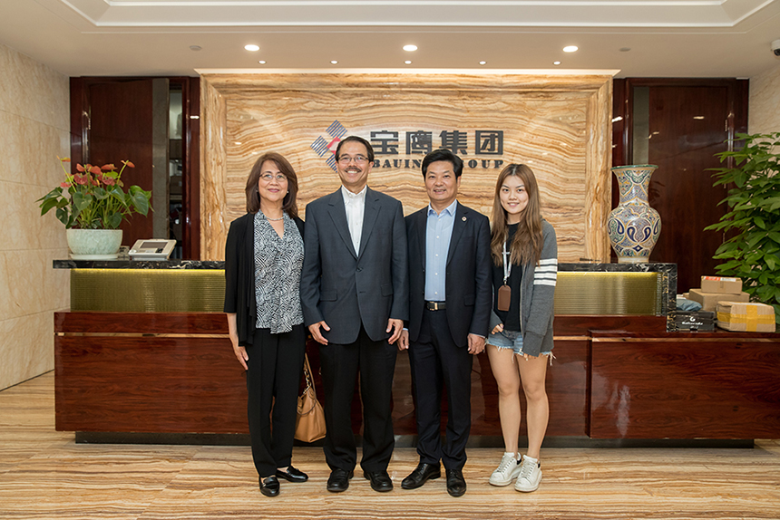 孔拉多·甘伯紹(Conrado Gempesaw)校長夫人克拉維爾·甘伯紹 (Clavel Gempesaw)、圣約翰大學國際教務處特邀顧問,生物技術學院主任陳哲生(Jason Chen)、寶鷹股份董事長古少波、寶鷹股份副總裁王暉、寶鷹集團國際事業部總經理吳義課參加交流。