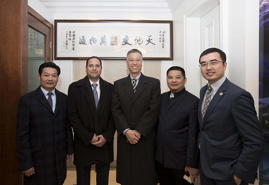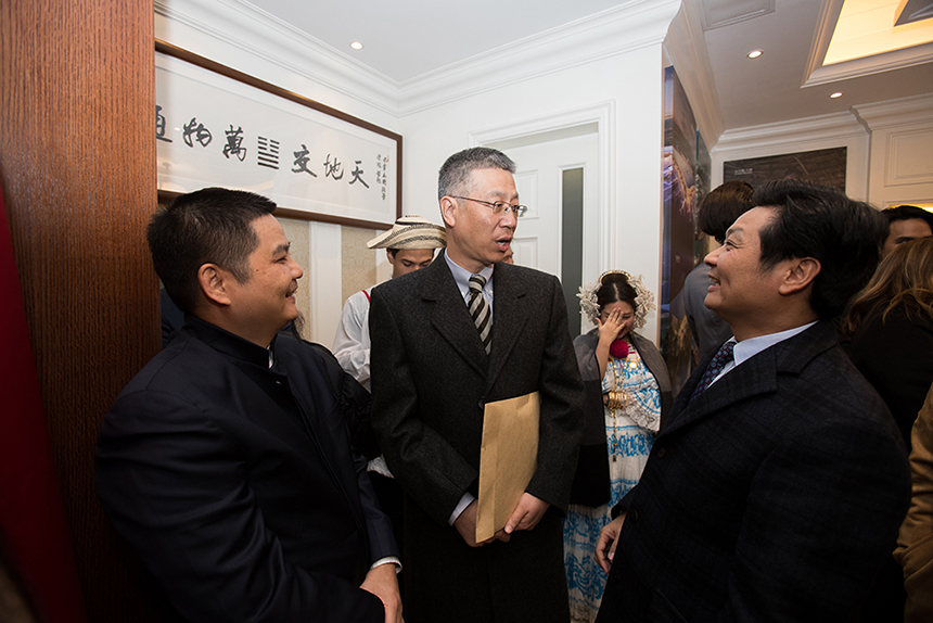 ▲巴拿馬駐華大使施可方(左二)、中國駐巴拿馬大使魏強(左三)與古少明主席(左一)、古樸副總裁(右二)在“天地交 萬物通”書畫作品前合影留念,期待中巴友誼與經貿合作前景無限