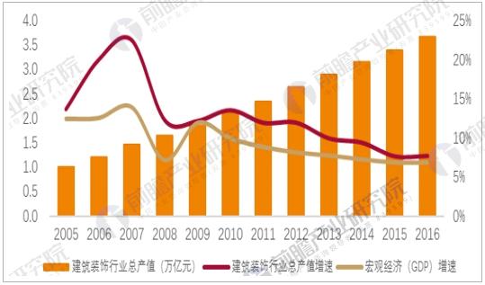 建筑裝飾業為我國建筑行業二級分類中的一個分支,根據建筑物使用性質不同又可以進一步細分為建筑幕墻(外裝)、公共建筑裝修(內裝)、住宅裝修。據前瞻產業研究院發布的《建筑裝飾行業發展前景與投資分析報告》數據顯示,2016年全國建筑裝飾工程總產值為3.66萬億元,同比增長7.65%。