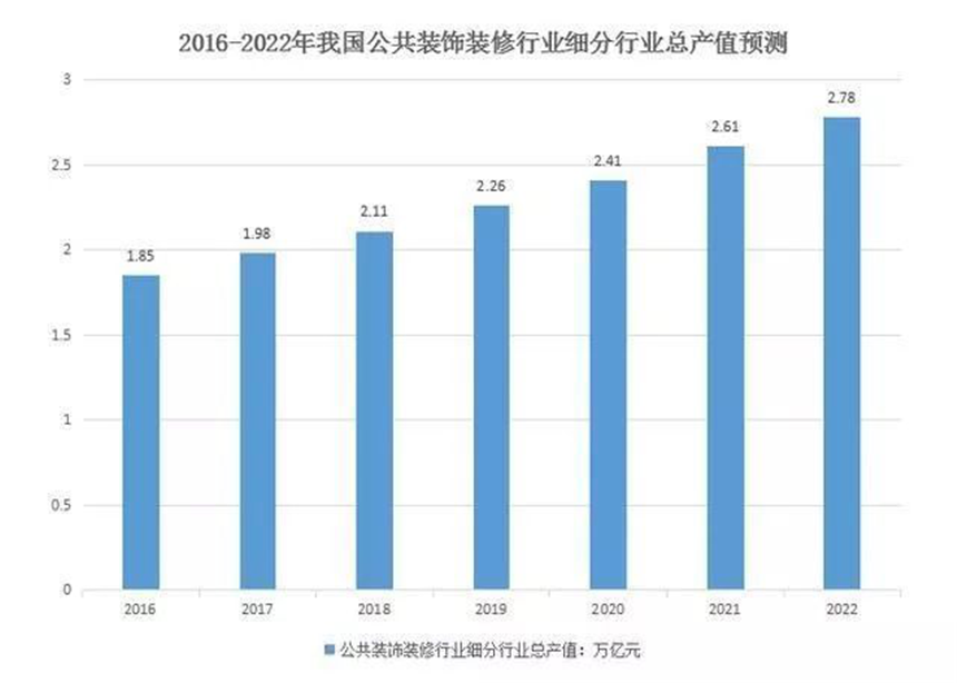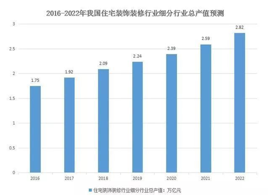 數據顯示,預計到2022年我國住宅裝飾裝修市場總產值將首次超過公共建筑裝飾裝修行業總產值,達到2.82萬億元,住宅裝飾裝修市場總產值占整體市場產值的50.36%。2022年我國公共建筑裝飾裝修行業總產值將達到2.78萬億元,住宅裝飾裝修行業總產值達到2.82萬億元。