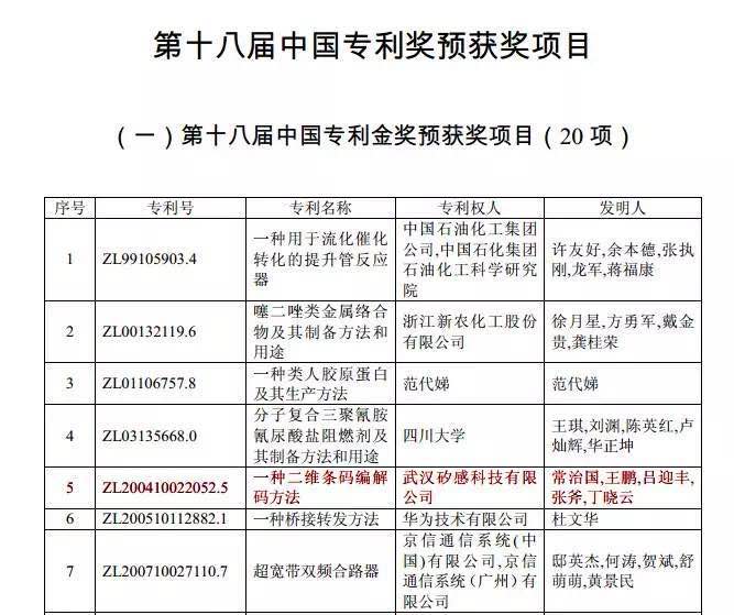 近日,從中國專利獎評審辦公室獲悉,武漢矽感科技有限公司的發明專利“一種二維條碼編解碼方法”喜獲第十八屆中國專利金獎。
