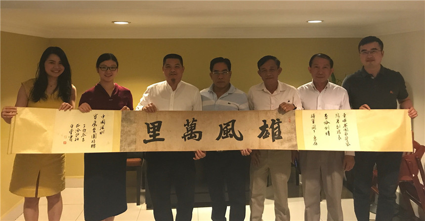 ▲寶鷹集團副總裁古樸(左三)向柬埔寨國家警察總署副總長查哈利特將軍(左四)贈送西泠社人、寶鷹美術館館長王躍慶書法作品《雄風萬里》