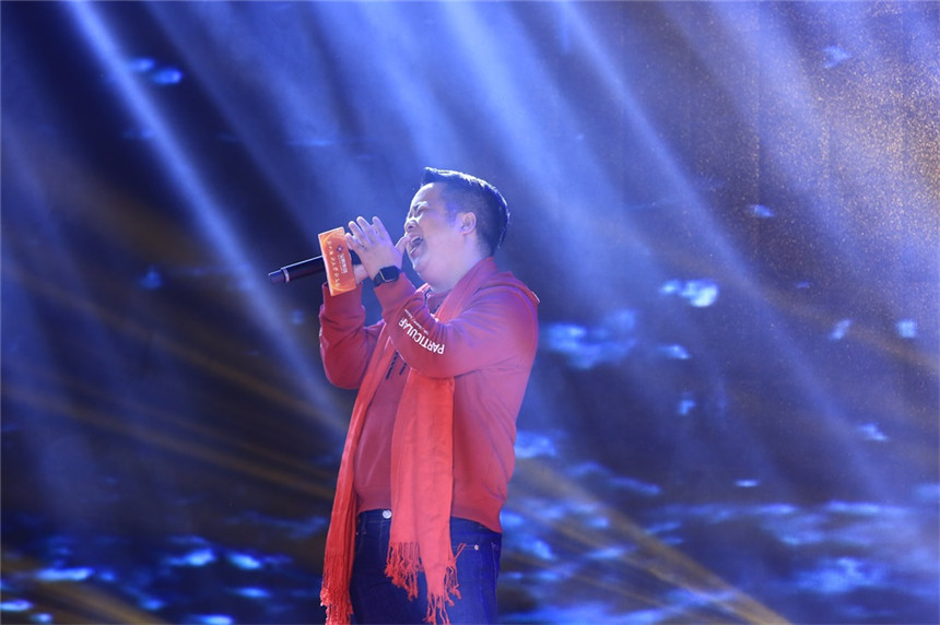 ▲寶鷹集團(tuán)董事局主席古少明領(lǐng)唱《沒(méi)有共產(chǎn)黨就沒(méi)有新中國(guó)》