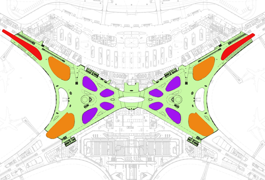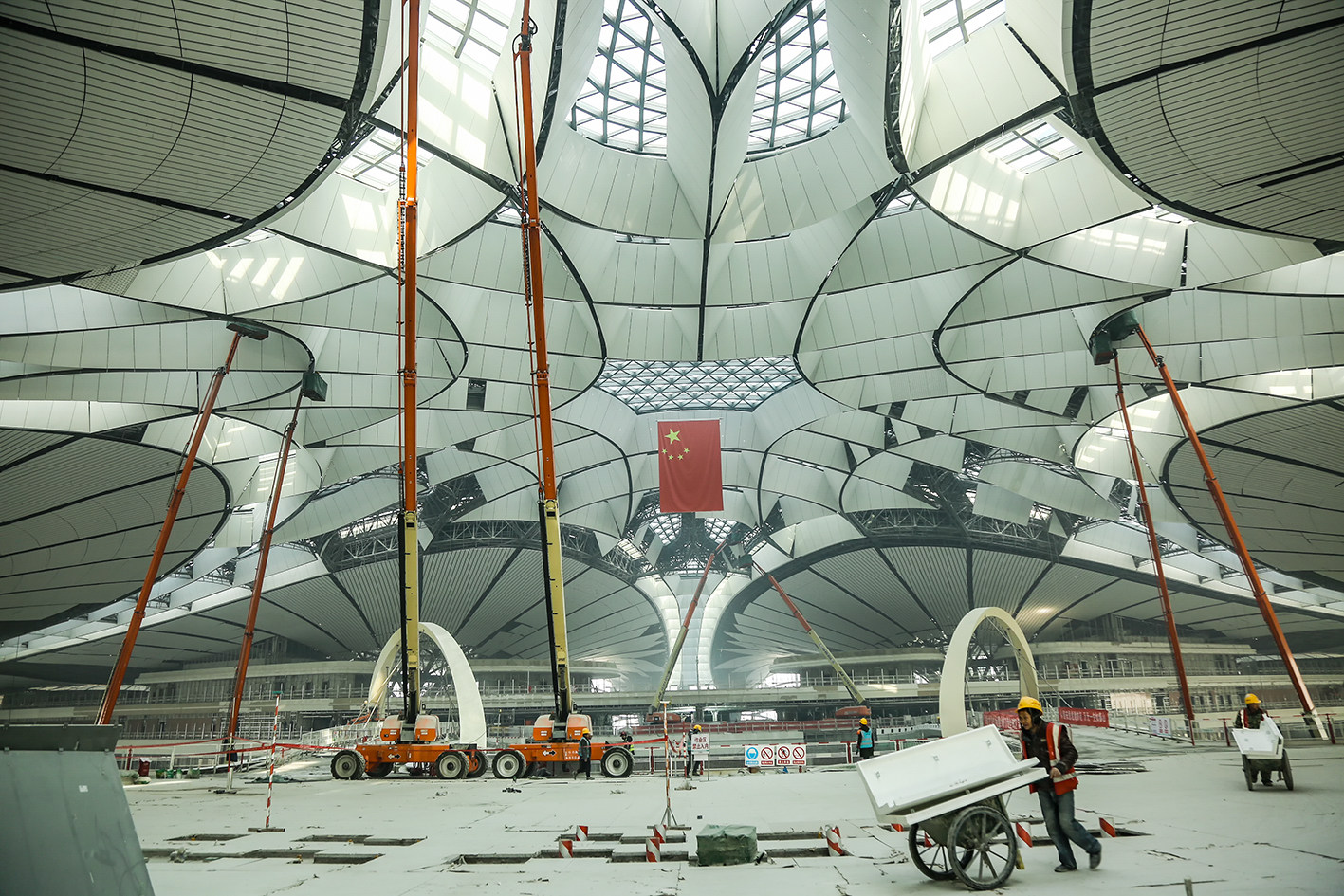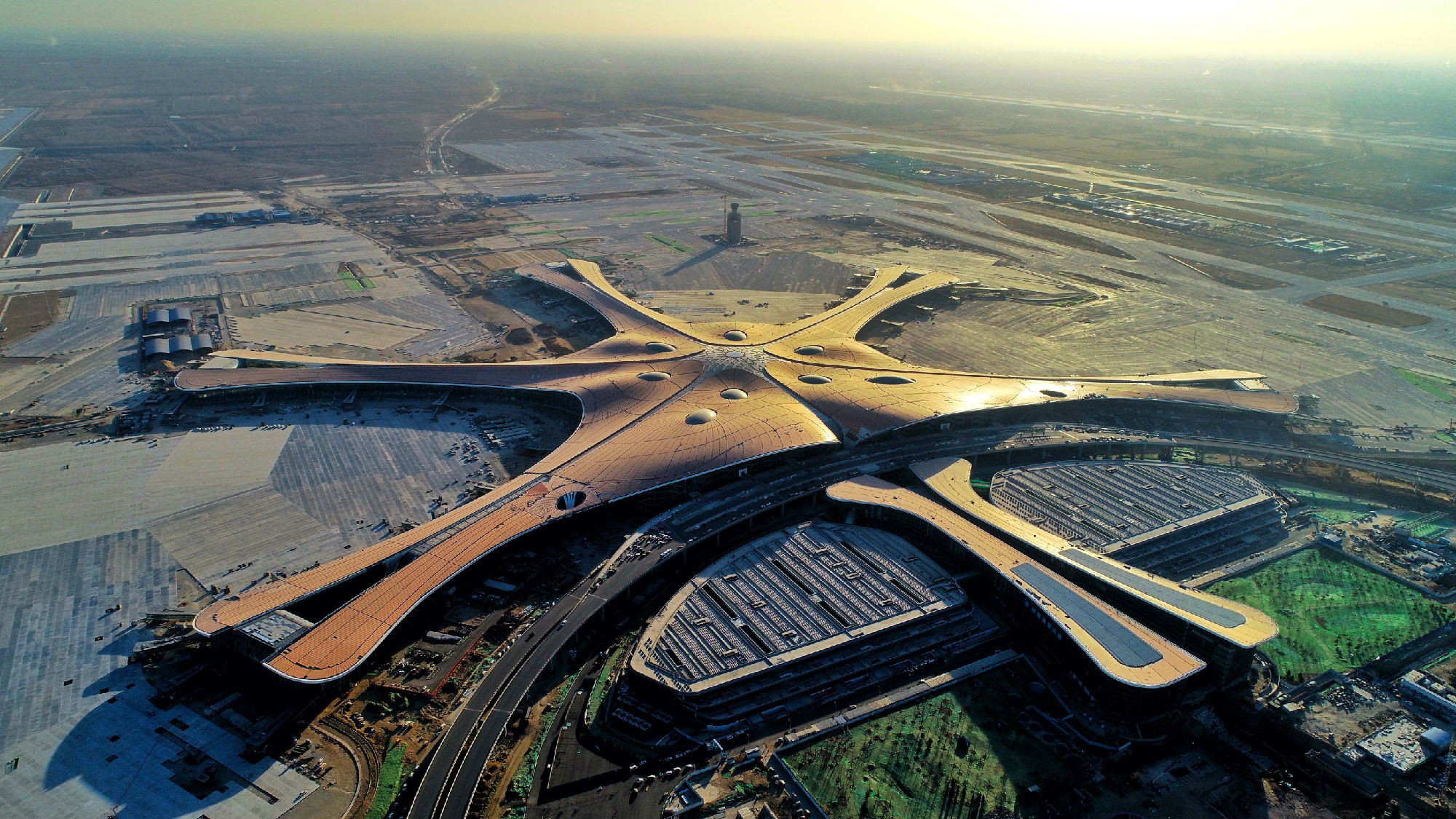 北京大興國際機場被稱為世界最大機場,是國家重點工程項目。總占地面積4.1萬畝,航站樓面積達18萬平方米,總投資約800億元,是中國規模最大空地一體化交通樞紐,集高鐵、城際、地鐵于一體,服務北京、天津、廊坊、保定、衡水與雄安新區。由法國ADP Ingenierie 建筑事務所聯手扎哈·哈迪德建筑事務所共同完成的概念設計——只有一個航站樓,以單點為中心,延伸出五條指廊,整個航站樓呈輻射狀構型。