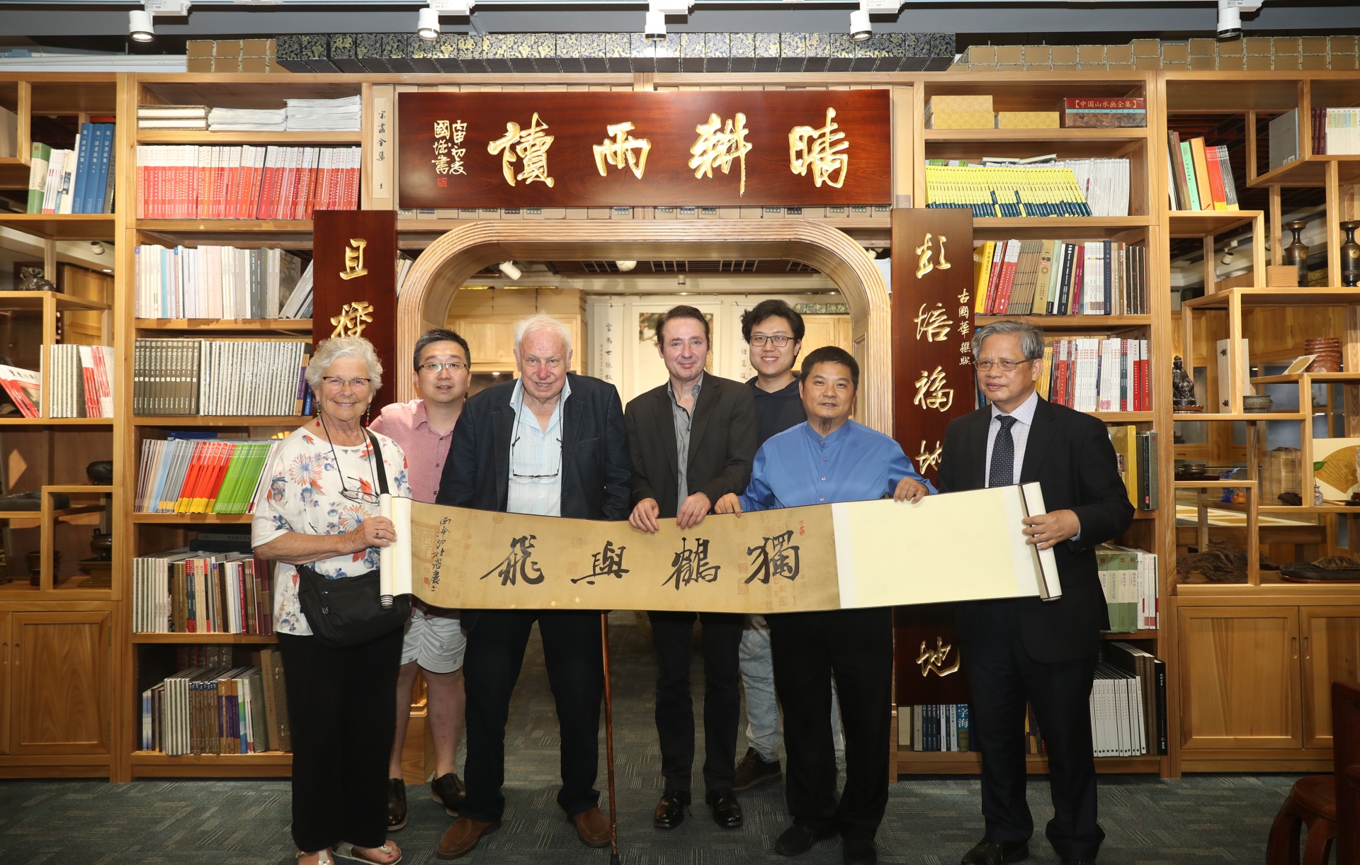 ▲ 寶鷹集團副總裁古樸向托馬斯院士贈送西泠印社社員、寶鷹美術館館長王躍慶書法作品《獨鶴與飛》