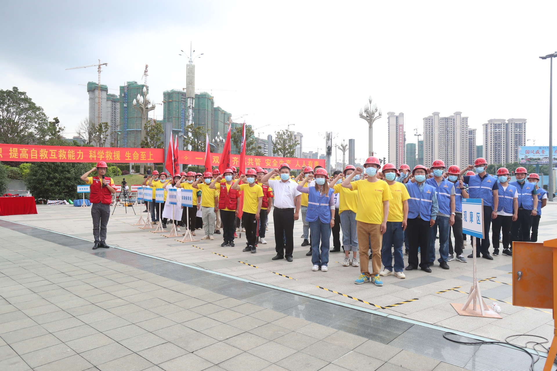 貴陽恒大文化旅游城物業服務中心總經理王觀峰,貴陽市花溪區貴筑街道辦事處安監站站長王江、貴筑派出所副所長羅玉平、消防救援大隊站長陳凌、貴筑社區衛生服務中心科長雷鳳敏、江蘇南通三建集團股份有限公司(總包)項目經理張小峰、貴州宇建工程管理咨詢有限公司(監理)總代李慈等300余人共同參與本次演練活動。
