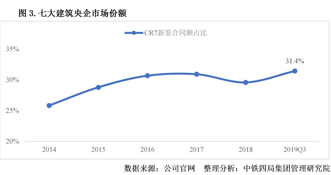 2.行業集中度持續提升。從中國建筑、中國中鐵、中國鐵建、中國交建、中國電建、中國能建、中國中冶7大建筑央企年度新簽合同額占建筑業全部新簽合同額的比例可以看出,7大建筑央企市場份額自2014年后持續提升,至2019年三季度達到31.44%,一定程度上表明建筑行業的市場集中度持續提升,建筑央企所占的市場份額越來越高,馬太效應愈加明顯。見圖3。