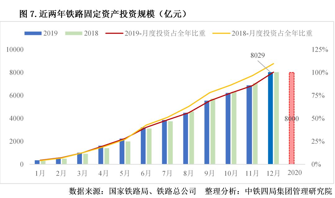 1.鐵路建設投資保持穩定。2019年,全國鐵路固定資產計劃投資8000億元,實際完成8029億元,與2018年投資完成額(8028億元)持平,完成計劃投資額的100.36%,鐵路固定資產投資總體表現平穩。根據2020年全國交通運輸工作會議精神,2020年全國鐵路固定資產投資計劃完成8000億元。見圖7。