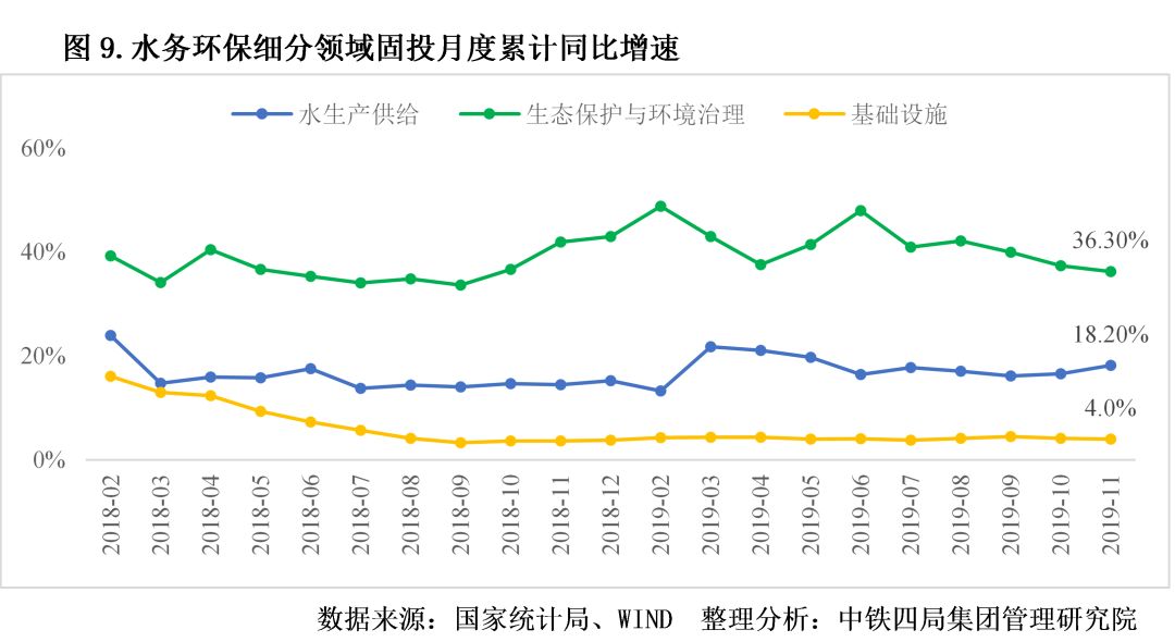 4.水務環保建設高速發展。2019年,在基礎設施投資增長緩慢背景下,水務環保市場依然保持高速增長態勢。截至11月份,生態環保與環境治理投資累計同比增速高達36.3%,高于同期基礎設施投資增速(4%)32.3個百分點;水的生產和供給投資累計同比增速高達18.2%,高于同期基礎設施投資14.2個百分點。根據中國環境保護產業協會發布的《中國環保產業發展狀況報告(2018)》顯示,2020年我國環保產業營業收入總額有望超過2萬億元。見圖9。