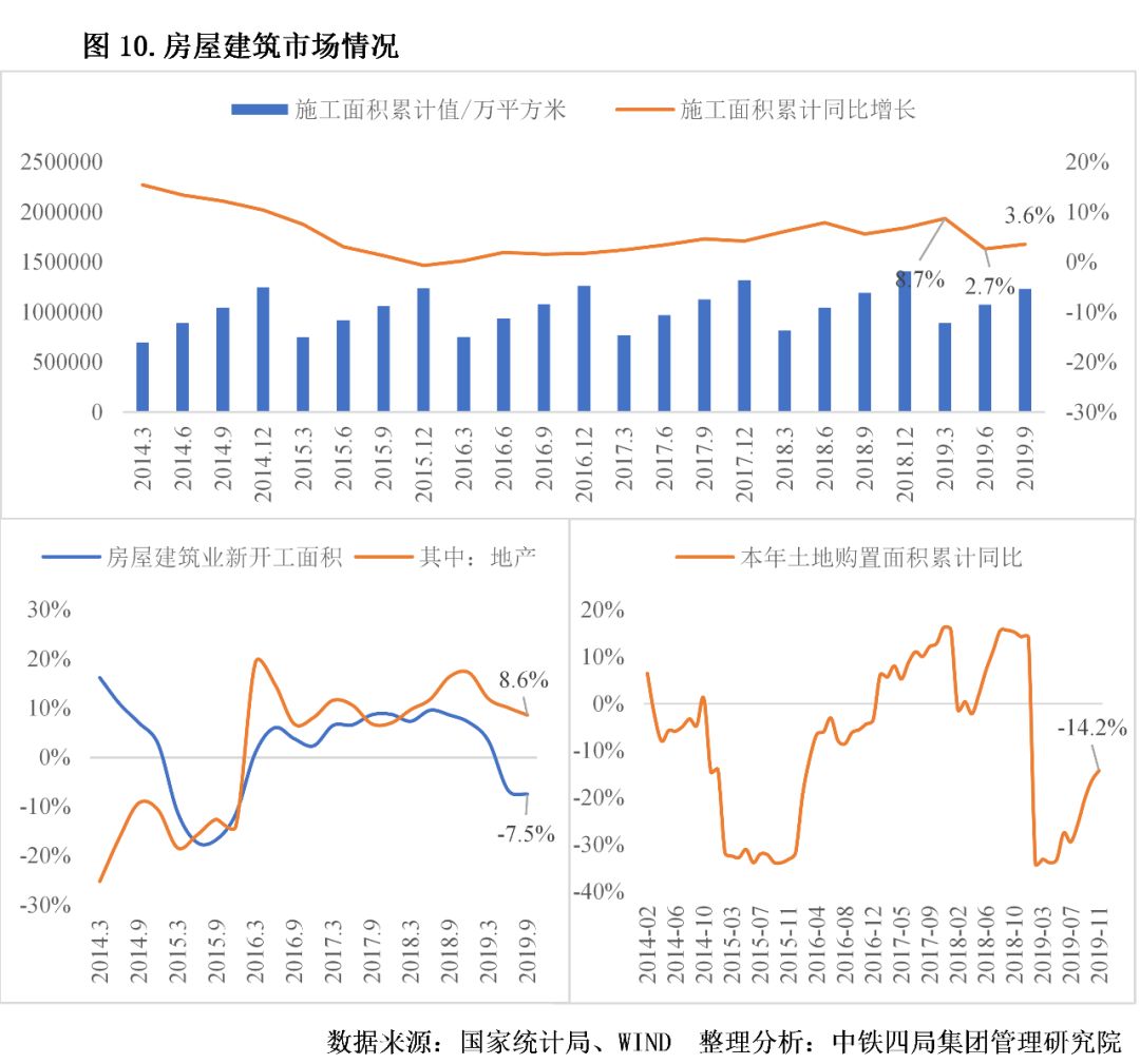 5.房屋建筑市場趨于穩定。2019年,房屋建筑施工面積在波動中保持增長態勢。房建施工面積的穩定與房地產市場的韌勁足有很大關系,前三季度房地產施工面積累計同比增速為10%。房地產市場的穩健發展得力于因城施策的進一步深化,各地政府堅持實施定向微調、保障合理住房需求,行業運行制度更趨完善,一定程度上保障了房地產市場的穩定。2019年前三個季度,房屋建筑業新開工面積增速為-7.5%,已連續兩個季度為負增長。其中,地產類新開工面積增速為8.6%,表明除地產以外的其他房建新開工情況堪憂(如公共場館、工業廠房建筑等)。從地產類土地購置面積來看,2019年累計同比增速持續為負,后續可能影響到房地產新開工面積和施工面積的增長。見圖10。