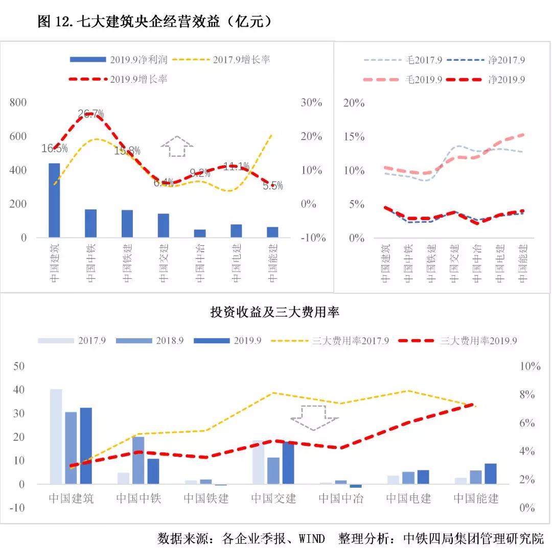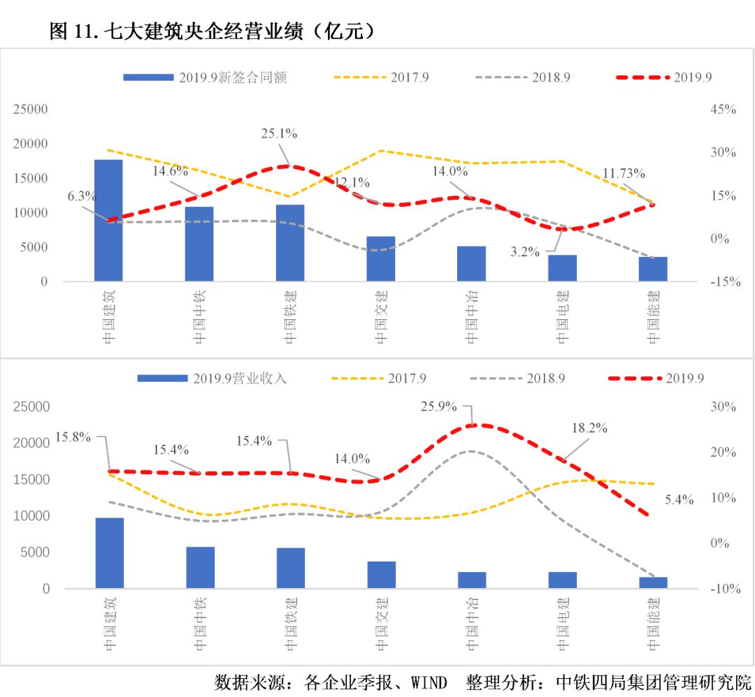 1.經營業績增速回升。2019年前三季度,七大建筑央企新簽合同額、營業收入增速較上年明顯提升,增速多在兩位數以上,明顯高于同期全國建筑業新簽合同額增速(4.38%)、總產值增速(6.7%)。由此可見,建筑央企的市場拓展能力和逆周期調節能力較強,建筑央企訂單加速增長,行業集中度持續提升。見圖11。