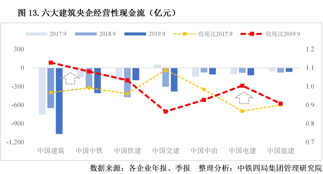 3.央企收現比明顯改善。從收現比(銷售商品、提供勞務收到的現金/營業收入)來看,近三年來,除中國交建、中國中冶、中國能建外,其他建筑央企收現比明顯改善。從現金流來看,工程施工企業的商業模式往往為前三季度現金凈支出,第四季度現金凈回流。近三年,各大建筑央企前三季度的經營性現金流普遍為負值,其中,中國建筑、中國中鐵、中國交建、中國電建2019年的現金凈流量負值進一步擴大。見圖13。