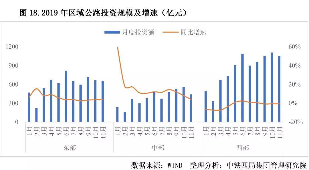 公路建設投資區域差距逐漸縮小。2019年我國公路建設區域投資格局保持不變,中部地區與東、西部地區差距進一步縮小。從投資規模來看,西部最高、東部次之,中部較低。從投資增速來看,中部地區公路投資從年初開始發力,以60.4%的增速開啟2019年的趕超步伐,2019年11個月平均增速達到16.4%;東部地區為6.0%、西部地區為-2.0%。2020年,中部地區或將進一步加大投資力度。見圖18。