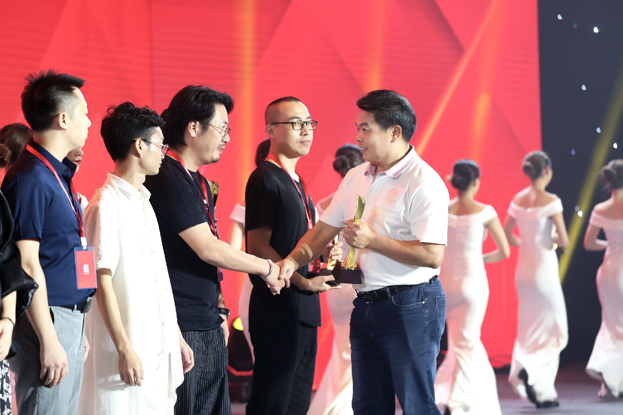 ▲中國建筑裝飾協會副會長、寶鷹集團董事長古少波為獲獎者頒獎