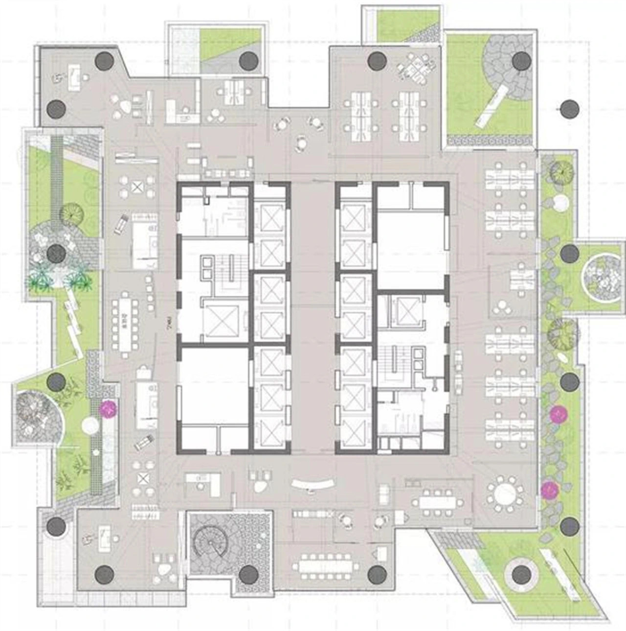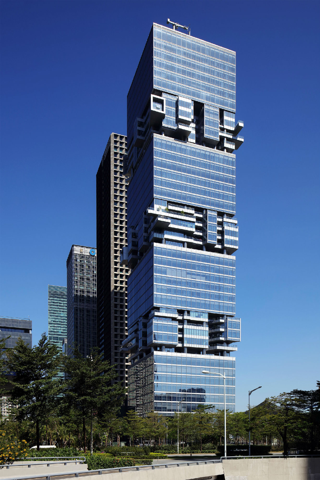 深圳基金大廈幕墻采用雙層單元體玻璃幕墻系統,是目前國內最先進、最復雜和最有特色的超高層幕墻工程。塔樓中間部位間隔采用空中花園布局,設置綠化空間和懸挑陽臺,優化了超高層辦公樓工作環境和舒適度。
