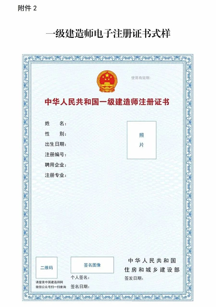 1.自2021年10月15日起,在全國范圍內實行一級建造師電子證書(具體示例及說明見附件1),電子證書式樣按照《全國一體化在線政務服務平臺電子證照一級建造師注冊證書》標準執行(具體式樣見附件2)。自2022年1月1日起,一級建造師統一使用電子證書,紙質注冊證書作廢。