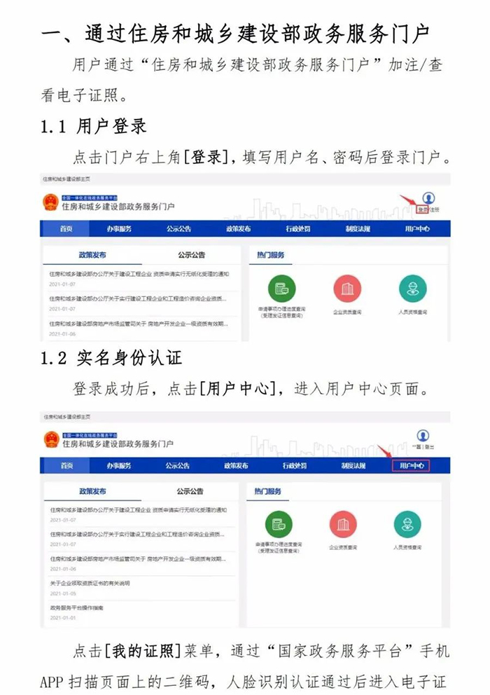 (一)一級建造師可登錄國家政務服務平臺、住房和城鄉建設部政務服務門戶查看和下載電子證書,具體操作流程可查閱《住房和城鄉建設部一級建造師電子證照申領和使用手冊》。查看和下載電子證書時,本人應確認該證書的使用時限。電子證書使用時限為180天,但使用時限距注冊專業有效期或建造師滿65周歲不足180天的,使用時限截止日期以注冊專業有效期截止日期或建造師滿65周歲當日為準。超出使用時限的電子證書無效,需重新下載電子證書并再次確認使用時限。