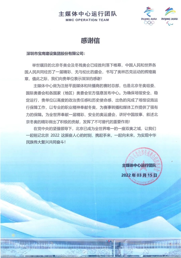 2022年3月15日,寶鷹集團(tuán)收到一封來自北京冬奧組委發(fā)來的感謝信!感謝寶鷹集團(tuán)為北京冬奧會(huì)賽事轉(zhuǎn)播和媒體工作保駕護(hù)航。
