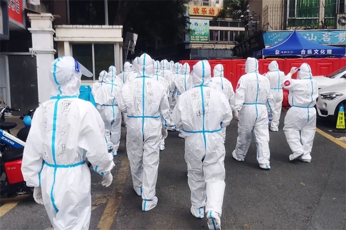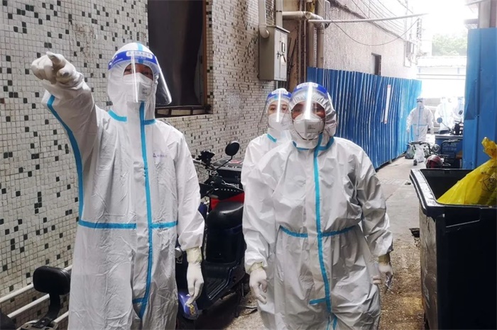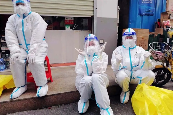 正值陽春三月,但深圳的氣溫已接近三十度,室外體感溫度更高。他們不分性別、不分年紀,穿著密不透風的防疫服,帶著雙層防疫手套,卸車、分揀、搬運,提著沉重的生活保障物資,挨家挨戶送貨上門、清理垃圾,一趟下來,身上早已汗如雨下。