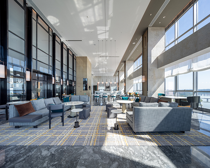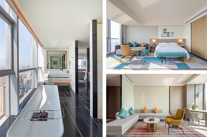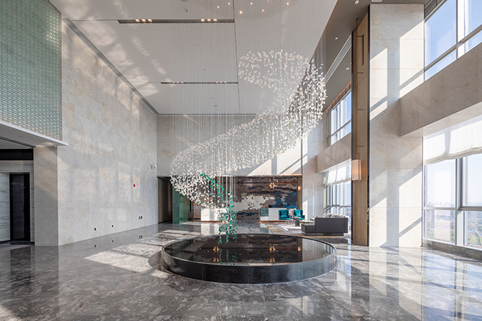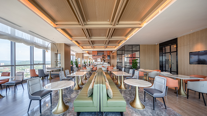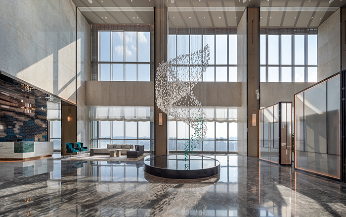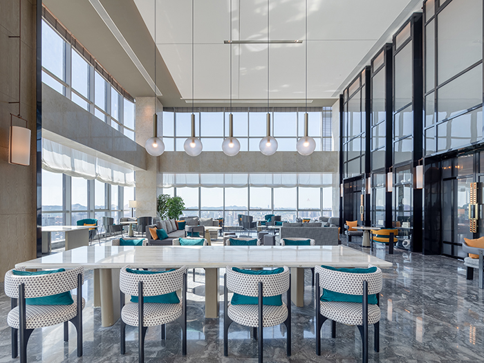 酒店的設計從南充歷史悠久的古鎮老街、絲綢文化汲取創意,將歷史文化與現代建筑完美結合。大堂以簡約大方的造型表達,整個空間色彩明快、柔和,既現代簡約,又時尚活潑,從視覺上凝聚顏色,從空間上體現美感。110米高空的超大雙層落地窗,可俯瞰南充市全景,展現人們對自由生活享受的向往。