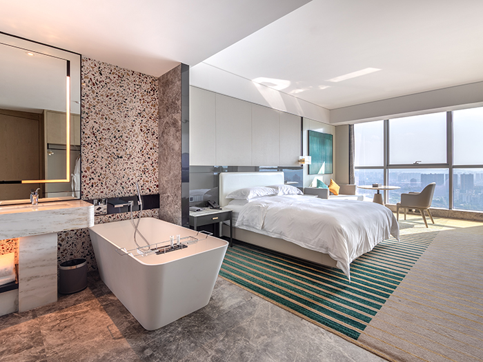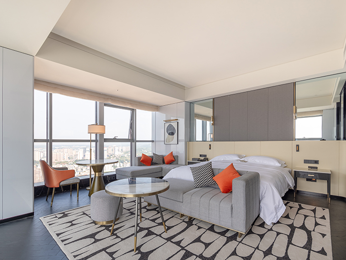 276間寬敞舒適客房,整體風格以現代輕奢為主。純粹率性的豎條打底墻面搭配精致燈具,淺白色的整體屋面配合墨綠和橘紅,讓人沉浸在整潔舒適、愉悅自在的氛圍之中。窗外,嘉陵江水波光粼粼,兩岸高低錯落的建筑和生態景觀盡收眼底,星級酒店氣質盡現。