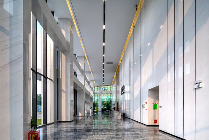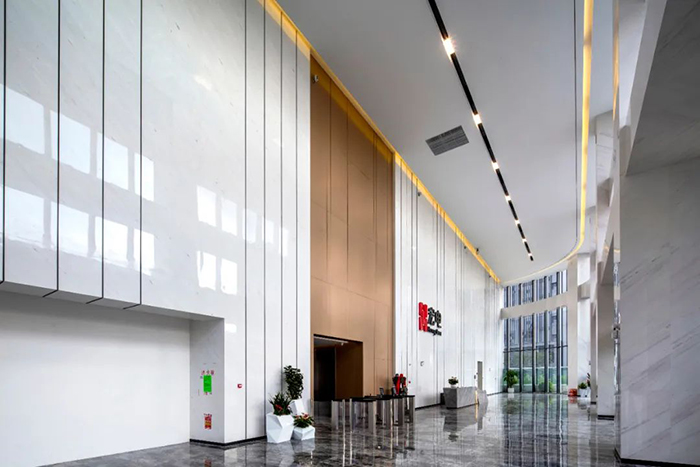 大堂作為企業最重要也是給客戶第一印象的空間,更應該是具有強烈的企業獨特性。宏電大廈在大堂的設計上摒棄了傳統的方式,化繁為簡,采用低碳綠色、高端簡約的設計理念,兼顧設計美學和可持續綠色的原則,采用超高空間、超大采光的立面裝飾,使大堂全天最大限度的接收自然光線的照射,為空間帶來純粹的視覺震撼。立柱和墻面選用白色大氣的環保石材,與地面平整光滑的深色搭配,一深一淺,勾勒出大廈整體低碳科技的主題色。