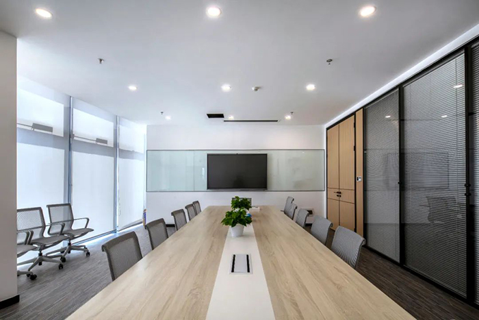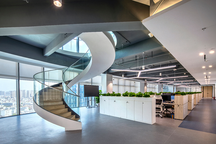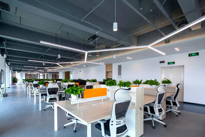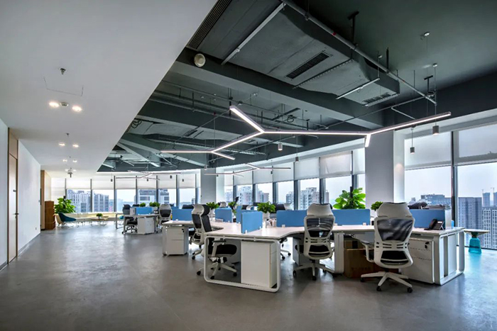 開放式的辦公區以簡潔為尚。高效實用的功能和舒適耐用的品質,是宏電關注的重點。大廈十九至二十四層分布多樣化差異化的集體辦公空間,整體以冷色調為主,Y字形的吊頂裝飾,呈現出企業的科技屬性。流動高效的辦公空間和良好的景觀視野,為員工營造愉悅的辦公體驗,最大限度的提高辦公的高效性和舒適性。