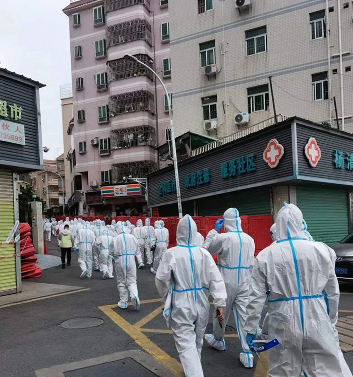 在寶鷹第五黨支部書記、副總裁陳貴涌的帶領下,志愿者們迅速集結到位,并在社區的協調安排下,快速化整為零,分成1個指揮組和多個網格行動小組,開展維護秩序、核酸檢測、做流調、環境消殺、垃圾清運、物資配送、配藥送菜、人員轉運等工作。大家相互配合,將各項工作安排得井井有條,有效消除了居民的焦慮情緒。