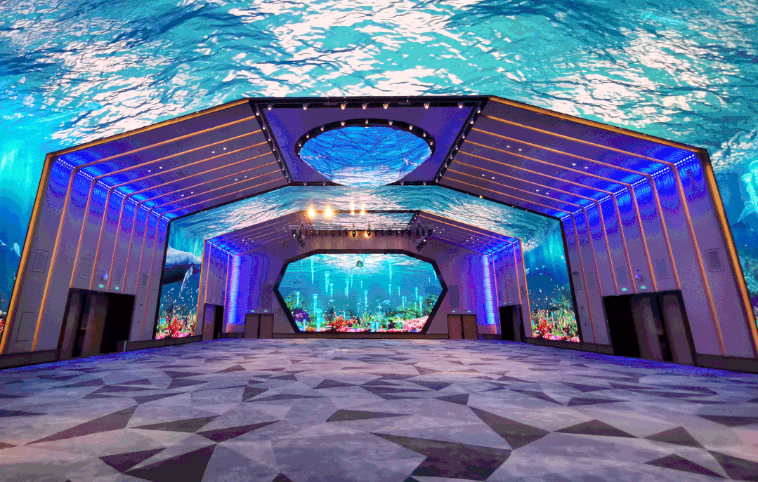 其中,寶鷹負責裝飾的商業宴會廳,采用全景沉浸式的無柱設計,結合1400平米超大空間、恢弘的動態裸眼3D畫面、立體環幕影像展示將實景與聲線、光影相融一體,呈現出身臨其境的極致感觀體驗。
