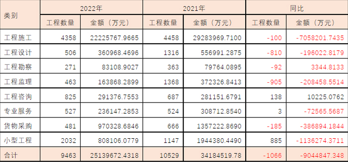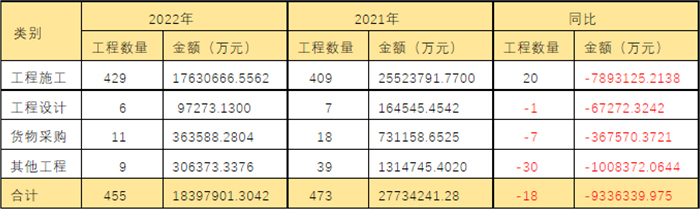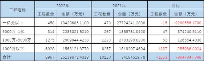 2022年重大項(xiàng)目逐步啟動(dòng),超1億元中標(biāo)金額的工程項(xiàng)目對(duì)比2021年度小幅降低,但總投資金額下降明顯,這對(duì)以承接大工程為主的施工企業(yè)來說,整個(gè)市場(chǎng)大項(xiàng)目投資金額降低,經(jīng)營空間進(jìn)一步壓縮。這對(duì)工程設(shè)計(jì)、勘察等方面也會(huì)造成影響。