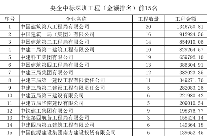 1、中央所屬建筑施工企業(yè)2021年在深圳市建筑業(yè)市場(chǎng)中標(biāo)排名前15名,按中標(biāo)數(shù)量排名如下: