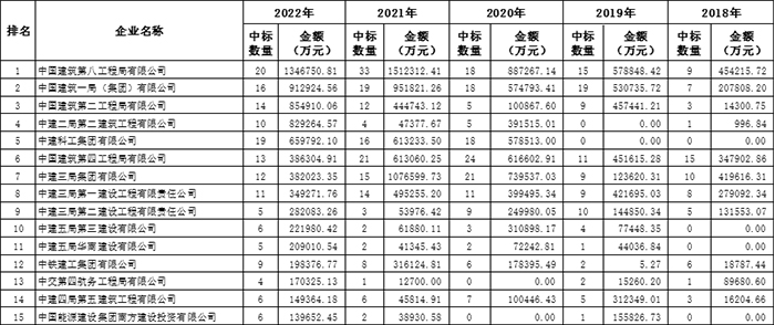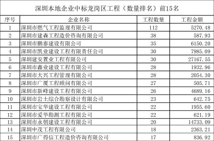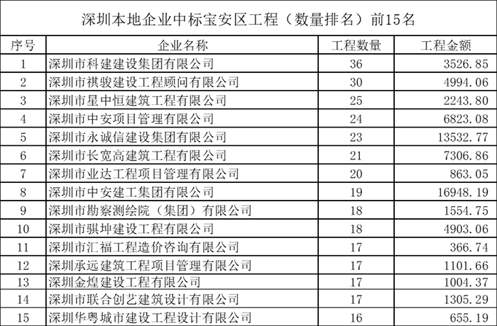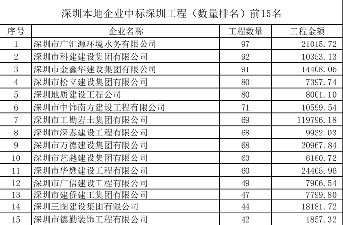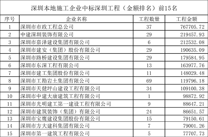 2、深圳本地建筑施工企業(yè)2022年在深圳市建筑業(yè)市場(chǎng)中標(biāo)排名前15名,按中標(biāo)金額排名如下:
