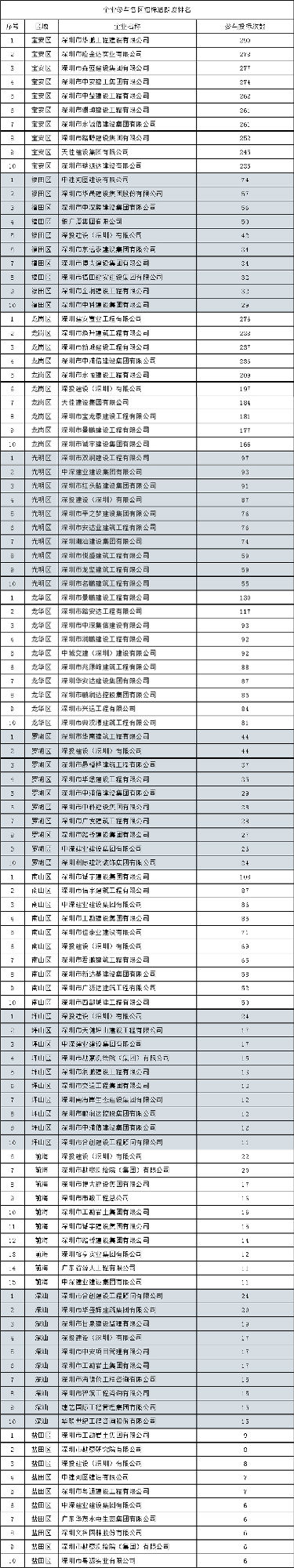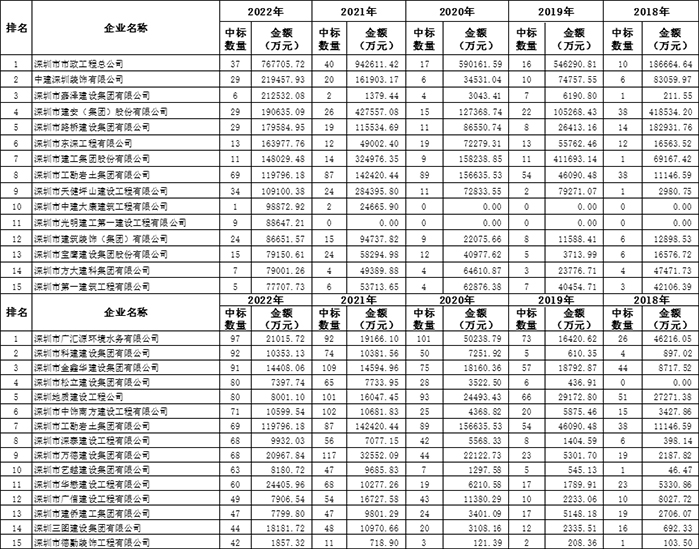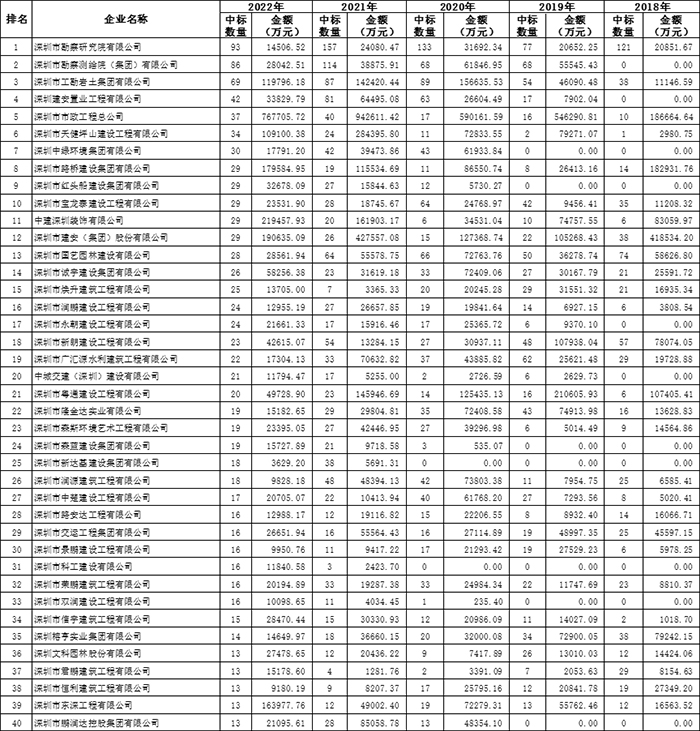 2021-2022年深圳市建筑企業(yè)“市政公用工程施工總承包一級(jí)和建筑工程施工總承包一級(jí)”企業(yè)在深中標(biāo)數(shù)量排名前40名單位如下: