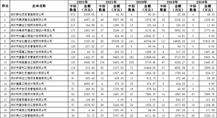近五年在深圳市建筑業(yè)市場(chǎng)活躍的企業(yè)中標(biāo)情況分析如下:
