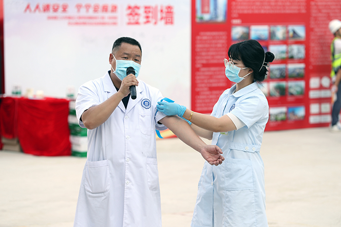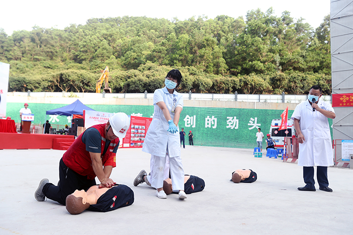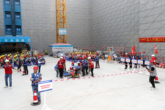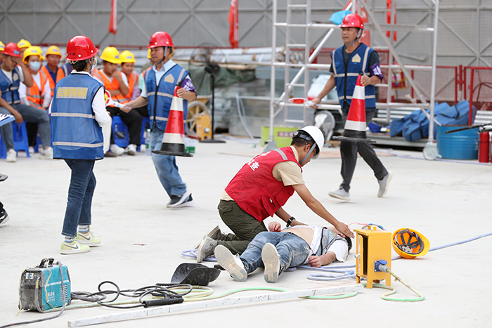 演練模擬汛期來臨、機械傷害、高處墜落、觸電傷害、火災等建筑工地現場常見的五種事故場景,充分考驗項目管理團隊面對緊急事故的應急救援能力。事故發生后,項目安全通訊組、搶險救災組、醫療救護組、疏散警戒組、后勤保障組第一時間有序科學地開展應急救援各項工作,隨后專業醫護人員、消防官兵現場進行專業知識培訓講解。各小組積極配合、迅速反應、及時報告、有序組織,演練達到預期效果,取得圓滿成功。