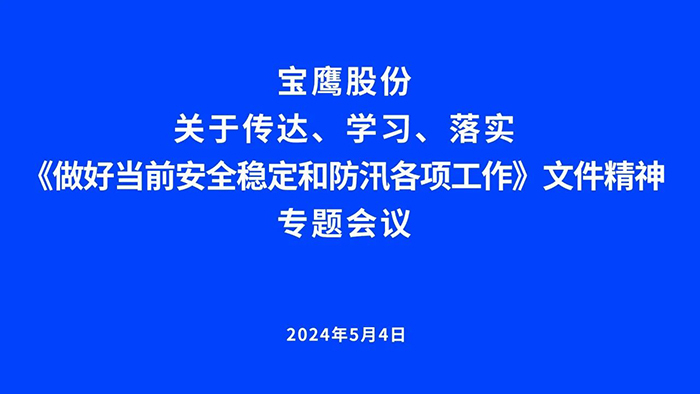 5月4日下午,寶鷹股份召開專題會議,傳達學習貫徹習近平總書記重要指示精神,貫徹落實李強總理批示要求,落實省、市、珠海國資委及大橫琴集團工作部署,迅速部署做好寶鷹股份安全穩定和防汛各項工作。