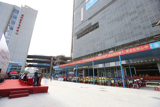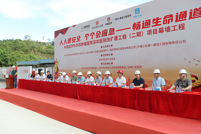 深圳市建筑工務署工程管理中心副主任符翔、項目工程師殷積彪,深圳市裝飾行業協會常務副會長、總工程師王彥波、培訓中心主任莫晉里,深圳市龍崗區龍城街道辦副主任程俊雄、副主任雷煥雄,深圳市龍崗區大運城消防救援站副站長何明,重慶賽迪工程咨詢有限公司大灣區分公司總經理付光平,中建三局集團(深圳)有限公司一公司安全總監劉振曉,深圳仁安醫院常務副院長吳云劍,深圳市寶鷹建設集團股份有限公司董事長肖家河、副總裁鐘志剛、安全管理部總監陳龍、幕墻事業部總經理韓偉杰、公司技術負責人葉石堅等相關領導以及中國醫學科學院腫瘤醫院深圳醫院改擴建工程(二期)幕墻項目建設者參加活動。