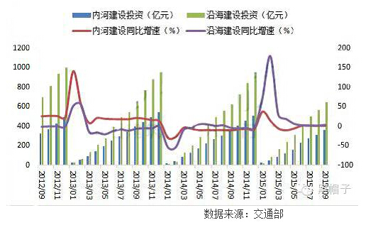 2015年前三季度水運建設完成投資1007.63億元,同比增長3.23%。 其中,內河建設完成投資361.13億元,同比增長0.87%;沿海建設完成投資646.5億元,同比增長3.69%。