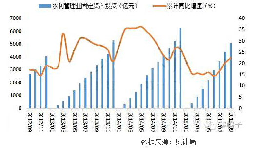 2015年前三季度水利管理業完成固定資產投資5130億元,同比增長22.5%,增速環比提高2.1個百分點,較2014年同期下降1個百分點。