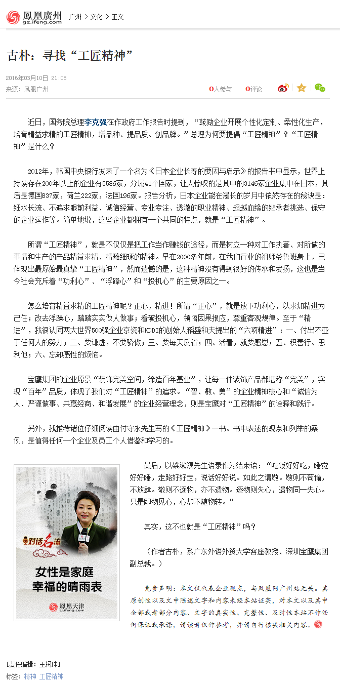 近日,國務院總理李克強在作政府工作報告時提到“工匠精神”,“工匠精神”是什么?為何要提倡?騰訊網、鳳凰網、新華網等國內多家媒體刊登寶鷹集團副總裁文章《尋找“工匠精神”》,且看古樸先生如何解讀。