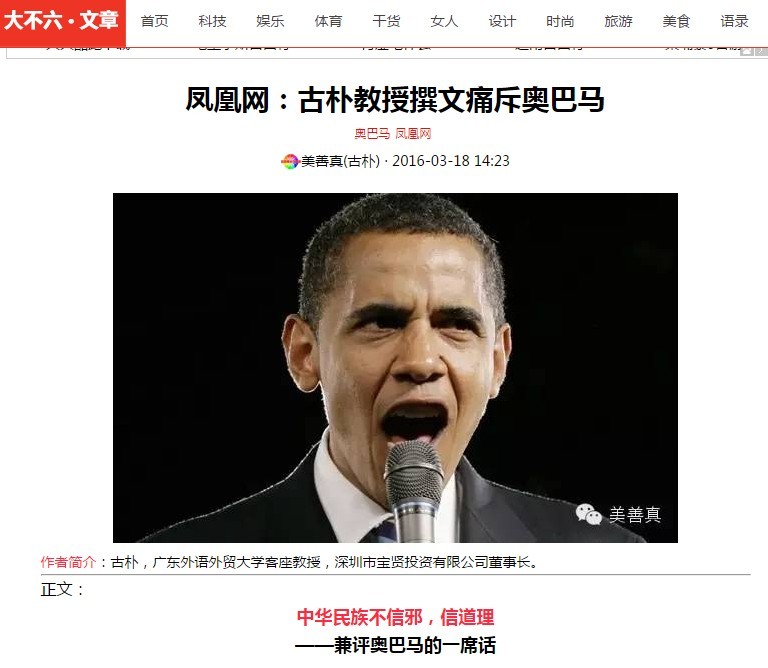最近一個視頻,美國總統奧巴馬在國會聽證會上說:“美國經濟衰退論那都是政治謊言,所以你聽到的那些言論都是敵人越來越強大,而美國越來越弱。聽我說,美國是世界上最強大的國家。在這個時代里,沒有之一。排名第二的差得遠呢,美國的軍費支出比其后的8個國家的加起來還多,美國的士兵是世界歷史上最好的。沒有國家敢攻擊美國或者美國的同盟國,因為他們知道那是自取滅亡。調查顯示,現在美國的世界地位比我剛當上總統的時候還要高,每當有重大國際問題出現時,世界人民不會找北京或莫斯科牽頭解決,他們找美國。”