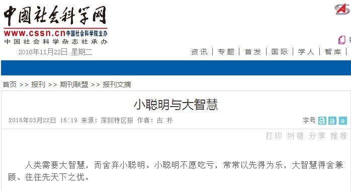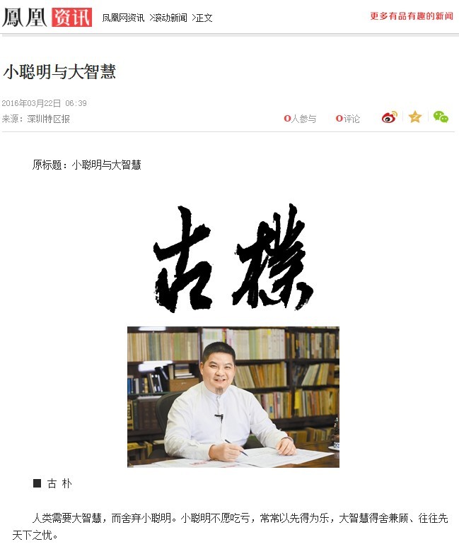近日,《深圳特區報》、鳳凰網、中國社會科學網等媒體相繼刊登轉載古樸副總裁文章《小聰明與大智慧》,全文如下:
