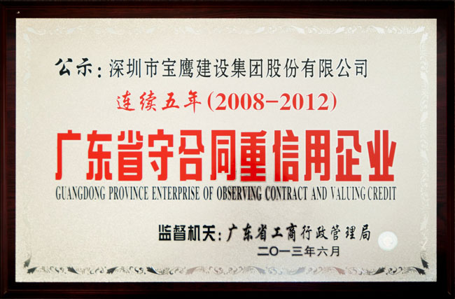 日前,廣東省工商行政管理局公示了榮獲2012年度守合同重信用企業(yè)名單,我司連續(xù)五年(2008—2012年)榮獲此項榮譽。