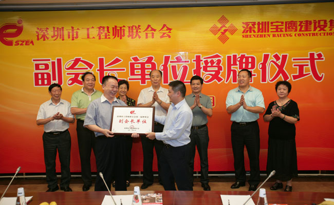 據悉,為給深圳建筑行業做出表率,打造深圳市建筑裝飾裝修龍頭企業,深圳市工程師聯合會決定授予寶鷹集團副會長單位。2013年9月2日下午,副會長單位授牌儀式在寶鷹集團舉行,原深圳市委書記、深圳市工程師聯合會榮譽會長厲有為,深圳市第四屆人大常委會副主任邱玫、深圳市工程師聯合會會長段忠等領導以及寶鷹集團董事局主席古少明、董事常務副總裁許平、副總裁古樸等參加了儀式。