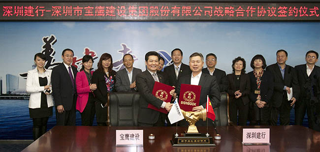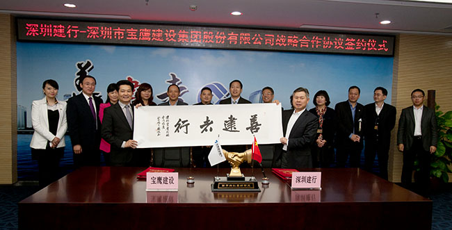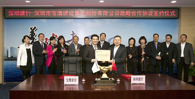 11月28日,中國建設銀行深圳市分行與深圳市寶鷹建設集團股份有限公司簽定了授信25億元的戰略合作協議。當日下午,在建設銀行深圳市分行與寶鷹股份相關出席領導的共同見證下,建設銀行深圳市分行副行長戴惠明和寶鷹股份董事局主席古少明分別代表建設銀行深圳市分行和寶鷹股份簽定了戰略合作協議。