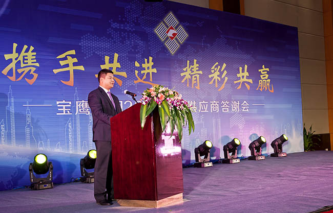 最后,古樸副總裁發(fā)表了熱情洋溢的祝酒辭,他對(duì)現(xiàn)場(chǎng)所有供應(yīng)商多年來(lái)與寶鷹股份結(jié)成的“攜手共進(jìn),精彩共贏”寶貴友誼表達(dá)了由衷的敬意和感謝,并期望以此次答謝會(huì)為契機(jī),增進(jìn)公司與供應(yīng)商之間的廣泛交流,推動(dòng)公司和行業(yè)的可持續(xù)發(fā)展。