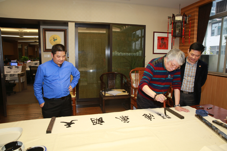 12 月25 日下午,中國書法家協會會員、廣州市美協主席、西泠印社理事、著名美術家、書法家周國城先生和中國書法家 協會會員、西泠印社社員、東莞市旗峰山藝術博物館館長王躍慶先生訪問了寶鷹集團,寶鷹集團董事局主席古少明先生、監事會主席胡蘭萍女士、副總裁古樸先生親切接待了周國城主席和王躍慶館長。