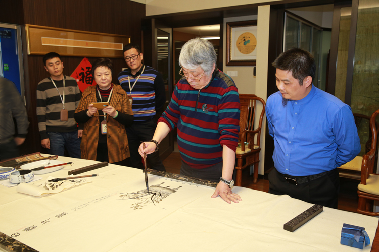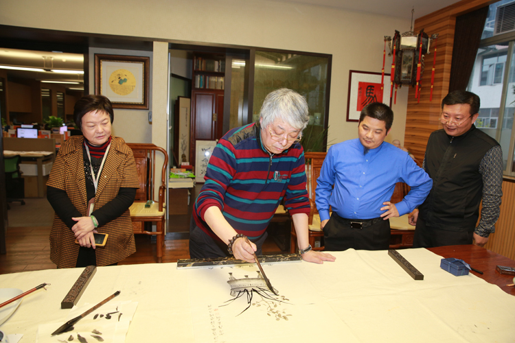 周國城主席揮毫寫蘭花(一)(右一為東莞旗峰山藝術館館長王躍慶先生,左一為寶鷹集團監事會主席胡蘭萍女士,右二為寶鷹集團副總裁古樸先生)
