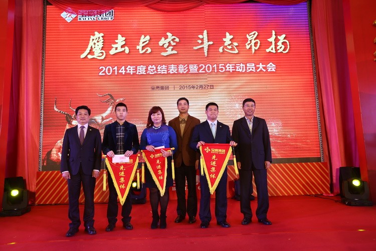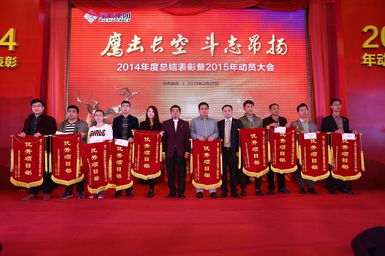 隨后,伴著喜慶的音樂,寶鷹集團監事會主席胡蘭萍宣讀了 2014 年寶鷹集團表彰決定,寶鷹集團諸領導分別為 2014 年度寶鷹集團優秀員工、優秀項目經理、優秀項目部、優秀部門經理、先進集體及最高年終獎獲得者頒獎。在發表獲獎感言時,各位代表皆同觀眾一起分享自己的喜悅、分享自己的工作經驗,表示將一如既往的努力不懈,為寶鷹做出更大貢獻。