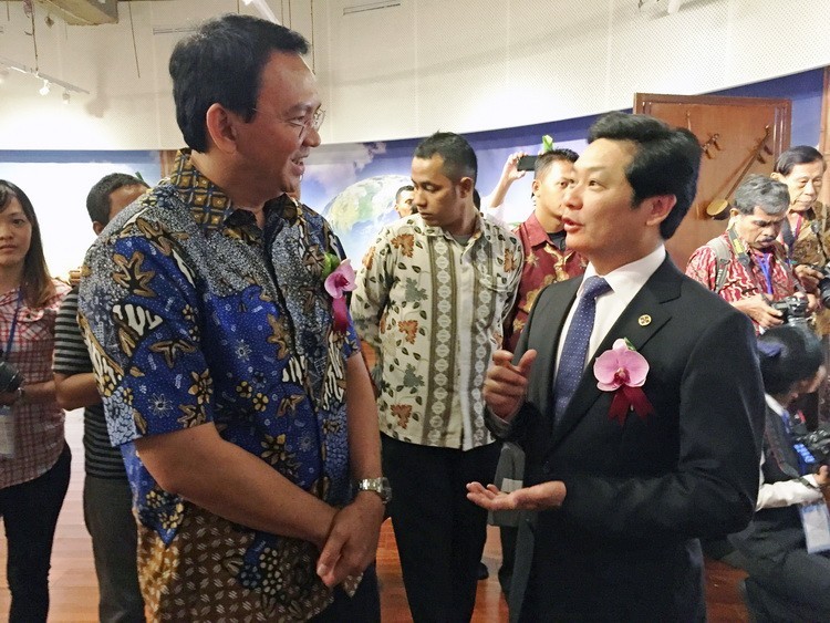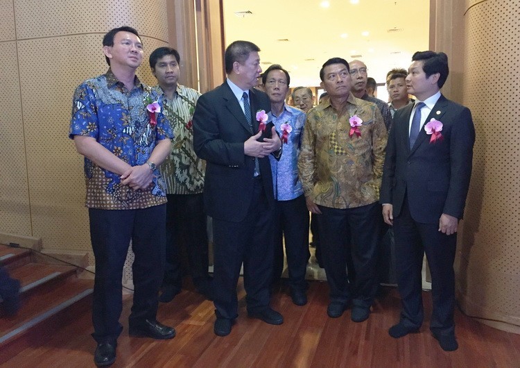 印尼慈濟基金會副執行長、印尼安達集團董事長郭再源(右三)向印尼三軍總司令MOELDOKO上將(右二)、雅加達省長鐘萬學(左一)和寶鷹集團董事局主席古少明(右一)等介紹慈濟園區已完工的第一期項目